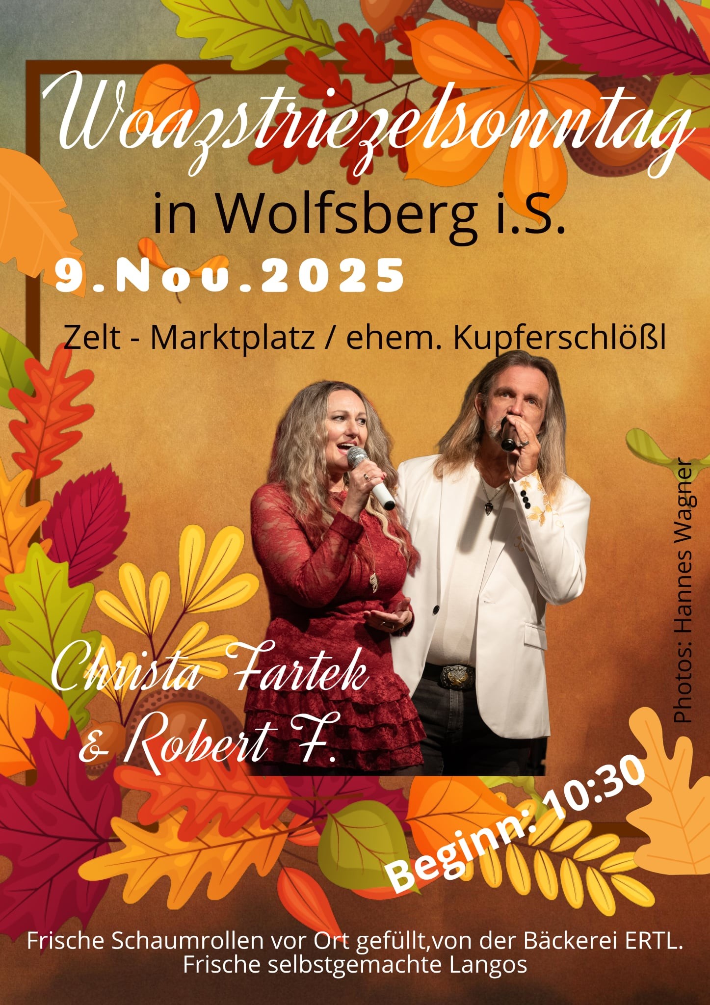november, 2025 2025 / Leider wegen Krank sein abgesagt! Woazstriezelsonntag in Wolfsberg i. Schwarzautal 09nov10:3014:002025 / Leider wegen Krank sein abgesagt! Woazstriezelsonntag in Wolfsberg i. SchwarzautalNähere INFOS folgen....10:30 - 14:00 Veranstaltung Details Veranstaltung Details Zeit(Sonntag) 10:30 - 14:00 CalendarGoogleCal